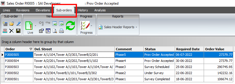 Split and manage a commercial project order into phases, each to be manufactured, delivered and installed separately.