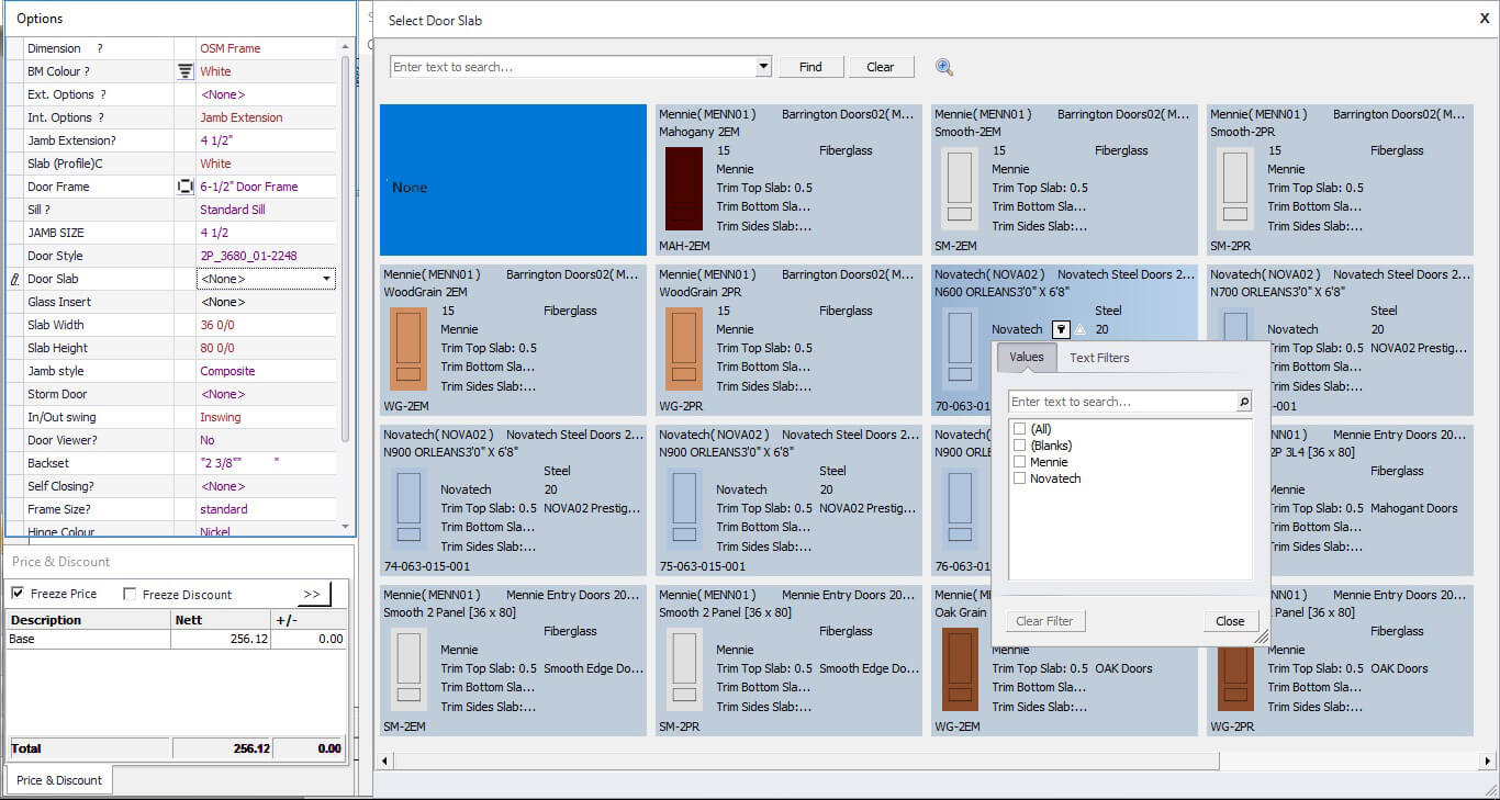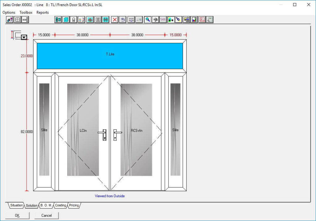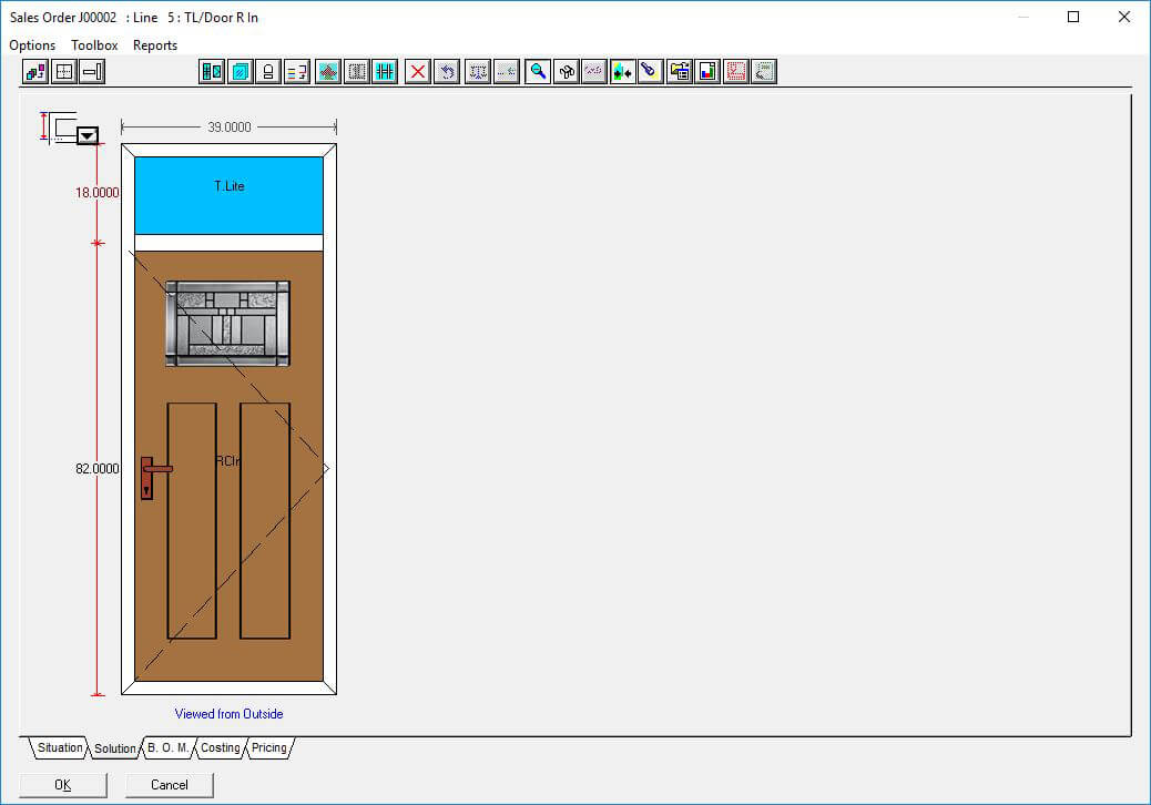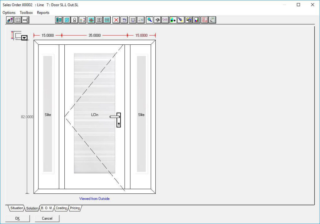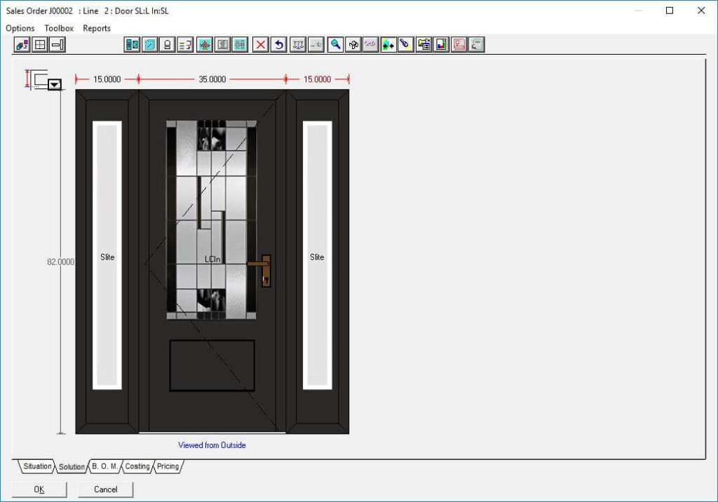 The Door slabs and glass inserts option in Windowmaker software allows you to configure complex entrance door designs with different styles and slabs for the door as well as sidelights. Using this option, you can select the supplier slab and glass insert ecatalog to use and plug it with the data easily.